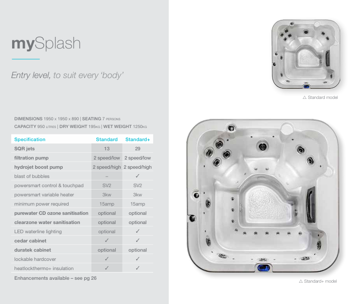 The simple design of our mySplash spa is an entry level 7 person model to suit ‘everybody’ and very popular amongst young families. Still amongst the compact spa range, this seamless layout features all upright seating making it a very social spa. There are 2 standard configurations offering either 13 jets or with additional air massage jets to bring the count to 29. The plus model also features an air blower so you get to experience our “blast of bubbles” feature along with LED waterline lighting. As with all of our Australian made spas, the mySplash is fully upgradeable with the enhancement option of wifi & digital control system.